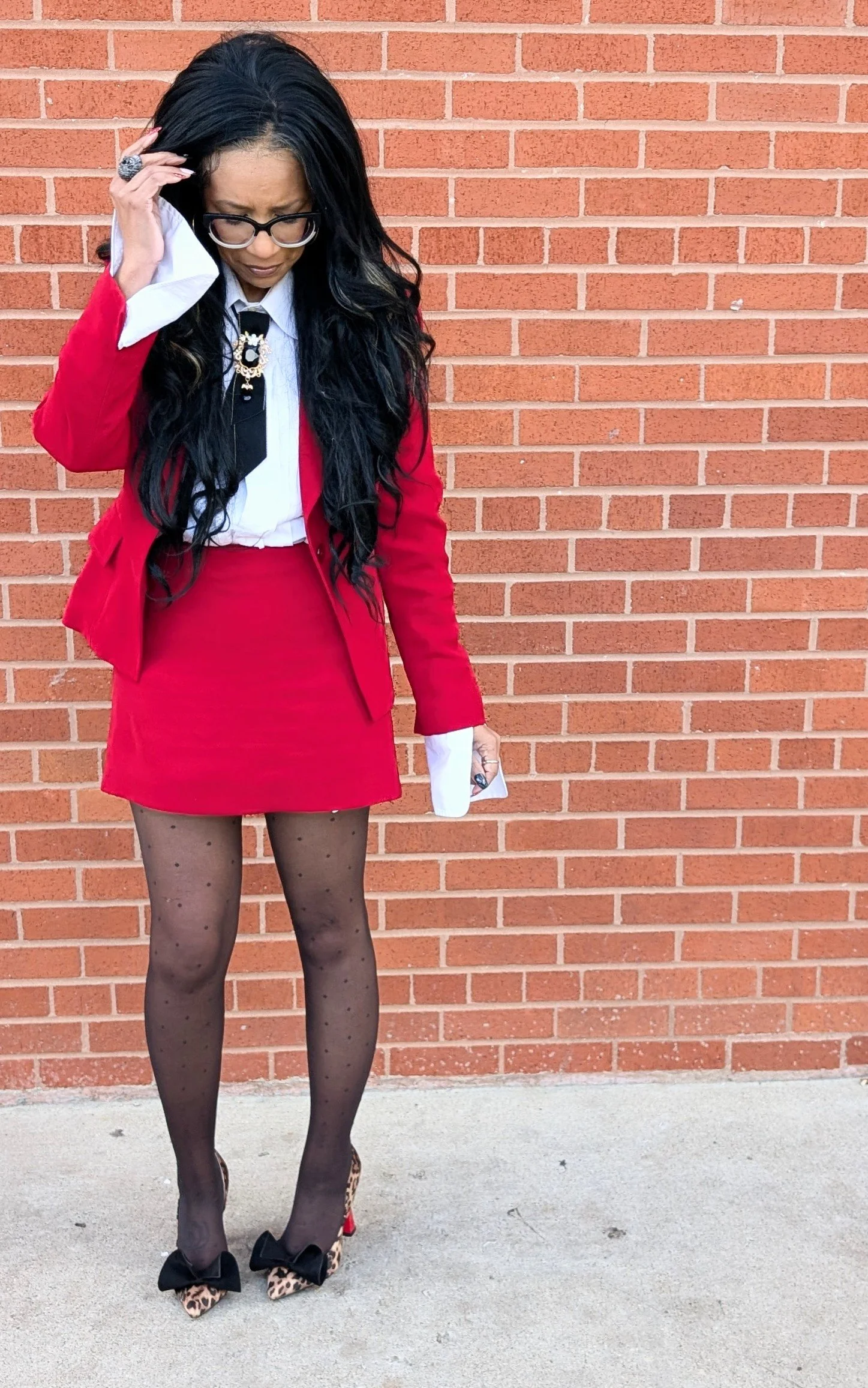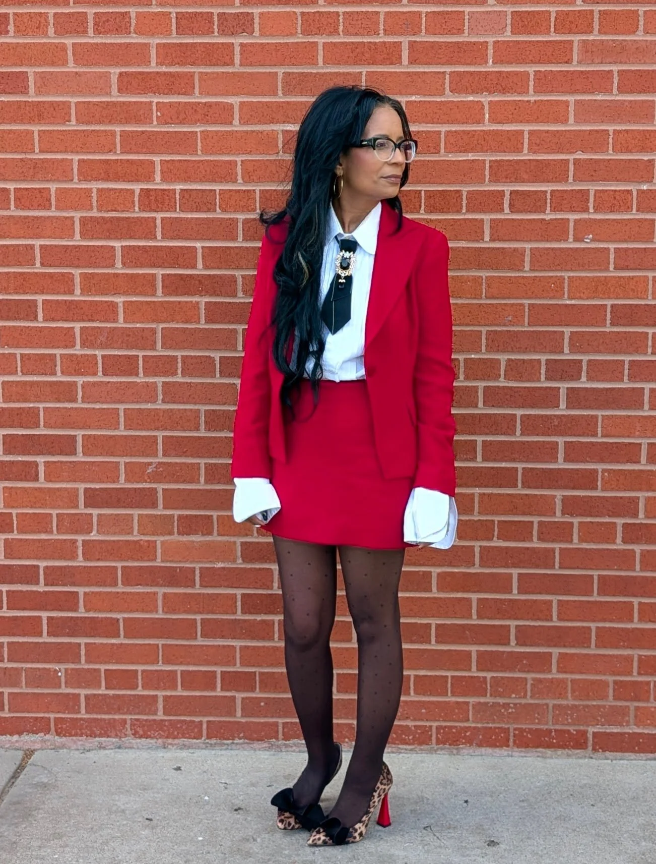 I styled it the way I style everything — maximally. White button-down with oversized cuffs, a black tie because no one looks better in a tie than a woman, polka dot sheer tights, and leopard print pumps with a black velvet bow and a red heel that matches the suit like it was fated.